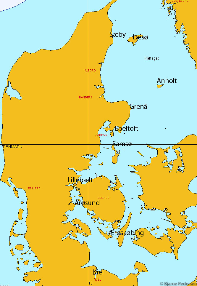Vinden ligger hele tiden i området 9-12 m/s (liten kuling), og gir gode seilforhold så lenge retningen er ok. Etappen begynner å bli såpass lang at vi velger å ta en overnatting i Årøsund, sør for Lillebælt. Dagen etter blåser det enda kraftigere, og på platt lens setter vi spriseil (storseil på den ene siden og forseilet på den andre) og seiler i timevis med 8-9 knop helt til vi kommer til Ærøskøping på Ærø.